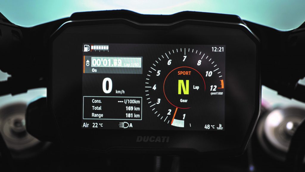 Certes, si vous sortez d'une « ancienne » Ducati Diavel, l'absence du tempo caractéristique du Desmo peut vous faire verser une larme... au début. Mais la mélancolie se mue vite en joie. Mieux : le V4 réussit le mariage entre grosse patate à bas régime et les hauts régimes hurlants. L'accélérateur procure un velouté addictif, le V4 se laisse aussi entraîner à moins de 1.000 tr/min sans protester. La nuance entre le mode Touring et le mode Sport s'avère assez flagrante, ce que l'on félicite car les diverses cartographies ont vraiment du sens. En mode Sport, le V4 est plus nerveux (mais pas trop) à l'accélérateur, tandis qu'en mode Touring, il devient souple comme un bon fauteuil. À ce propos, j'apprécie aussi cette face docile de son caractère, ce qui permet de ne pas avoir le cerveau en mode « full gaz » en permanence. Par contre, sauf en cas de météo pourrie, les modes de conduite Urban et Law ne seront pas souvent utilisés tant ils étouffent le V-quattro.