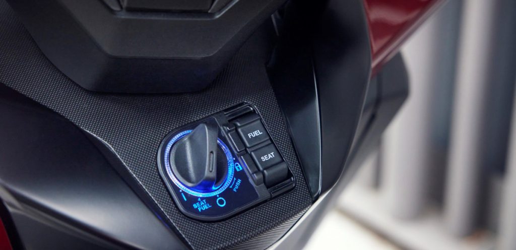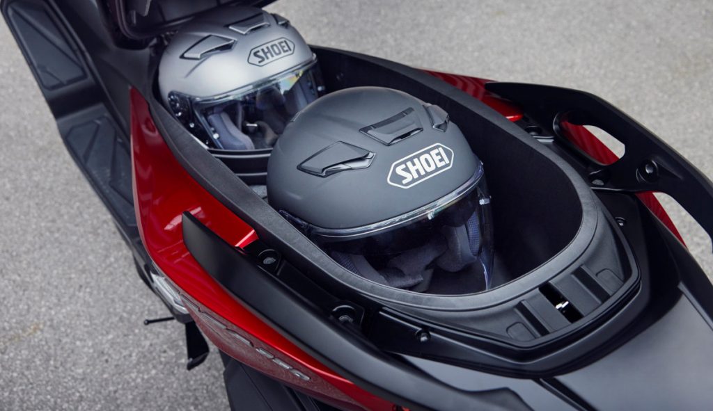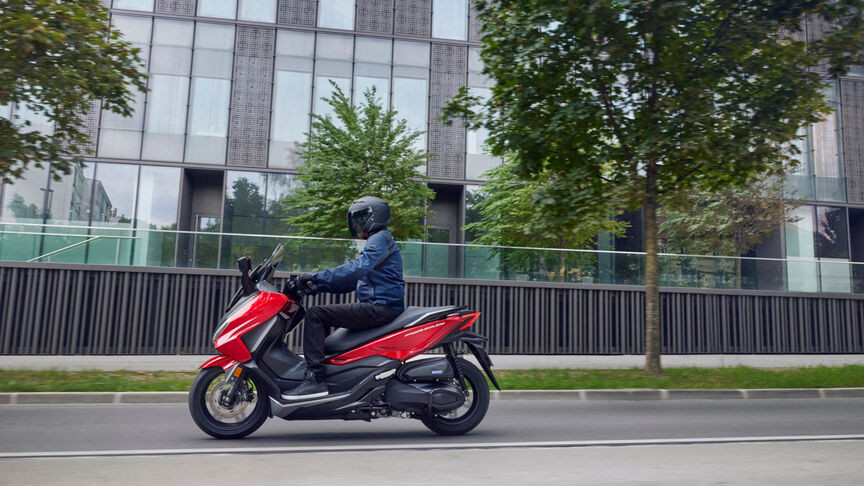 Le style est rafraîchi, mais l'exceptionnelle praticité demeure. Par exemple, la bulle s'ajuste électriquement sur un débattement de 180 mm pour maximiser la liberté ou la protection contre le vent grâce à une commande à portée du pouce gauche. Que vous soyez grand ou petit, le Forza s'adapte à tous les gabarits. Une prise USB Type-C dans la boîte à gants offre un point de charge pratique, le fonctionnement keyless du scooter renforce encore la commodité de son utilisation urbaine et deux casques intégraux peuvent être rangés sous le siège. Il est également possible de partitionner l'espace de rangement pour y loger un casque et/ou un vêtement de pluie et un sac de taille moyenne. « Simply clever », comme on dirait chez Skoda.