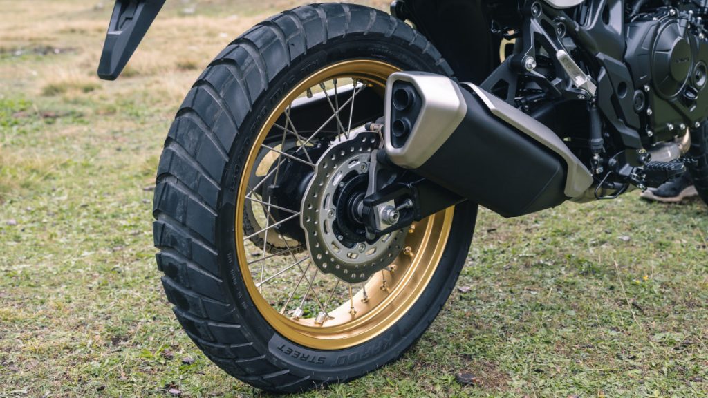 Délaissant le montage de pneumatiques de l'ancienne génération (700 cm3), Honda a opté pour une roue de 21 pouces à l'avant et 18 à l'arrière au lieu du tandem 19/17. Préférant même le montage de pneus à chambre en lieu et place des tubeless utilisés depuis des années. L'association de ces jantes à la suspension et ses 200 mm de débattement offrent un bon confort et une conduite précise. Le rembourrage de la selle vient encore contribuer à cette sensation de bien-être.