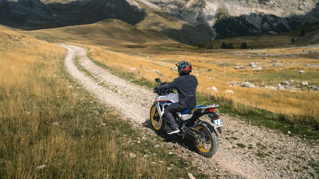 Une petite incursion sur un chemin de traverse m'incite à débrancher l'ABS sur la roue arrière via le mode off-road, de quoi optimiser la motricité et le freinage sur ce type de terrain. La garde au sol offerte par les roues de 18 et 21 pouces est appréciable. Mais pour les accros aux sorties hors bitume, il ne faudra pas hésiter à cocher quelques options pour équiper leur Transalp d'un sabot moteur et de protège-mains.