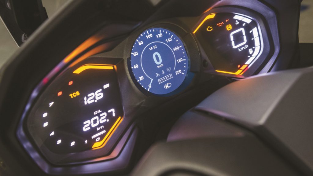 L'équipement de base est généreux et c'est un point que Kymco met en avant. Pour le confort visuel, l'écran reçoit un capteur de luminosité permettant de modifier automatiquement son rétroéclairage. La partie Noodoe est connectée et personnalisable via l'application smartphone du même nom (disponible pour iOS et Android). Le système offre comme fonctionnalités la notification au tableau de bord des appels téléphoniques, des messages, des alertes diverses, mais surtout la fonction de navigation.
