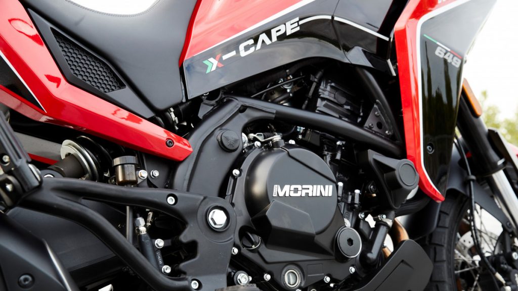 Cette Moto Morini X-Cape 650 est dotée d'un moteur agréable conçu à l'origine par Kawasakipour sa ER-6 mais dorénavant fabriqué sous licence chinoise. On retrouve donc l'incontournable bicylindre de 649cc avec une puissance rabaissée à 60 chevaux (à 8.250 tr/min) de la Versys 650 (67 ch et « made in Japan » celui-là). Une motorisation raisonnable pour une moto qui l'est tout autant. Si elle est fabriquée en Chine, les différents composants viennent de chez Bosch, Brembo et Marzocchi afin d'apporter la garantie d'une certaine qualité.