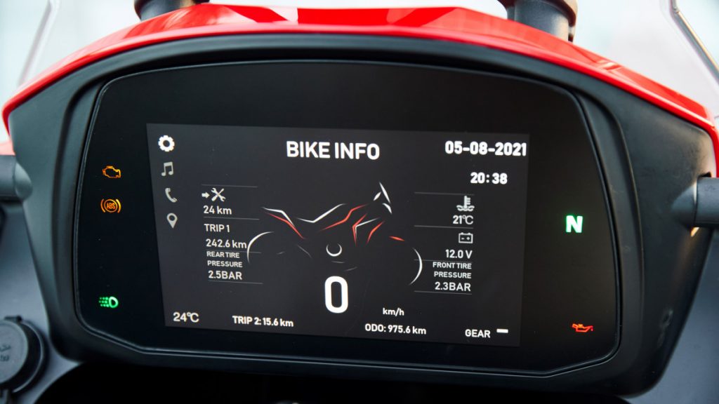 Une marque discrète, mais toutefois légendaire, vient se faufiler dans la très longue série des trails de moyennes cylindrées. Tombée entre nos mains pour quelques heures seulement, voici une première approche de cette Morini X-Cape 650 sur laquelle nous reviendrons plus en profondeur prochainement. D'un point de vue esthétique, c'est une réussite. Si les goûts et les couleurs ne se discutent pas, on ne peut nier que la Moto Morini (MM) a belle allure. De plus, des détails comme les couleurs italiennes sous le logo du réservoir et l'utilisation des aigles du logo MM sur le moteur et le carénage sont de belles références à l'histoire et à l'origine de la marque. Un énorme écran TFT (7 pouces !) affiche clairement toutes les informations. Les commandes situées à gauche permettent de naviguer dans les réglages et de choisir l'un des deux modes de conduite.