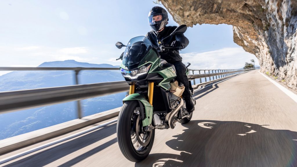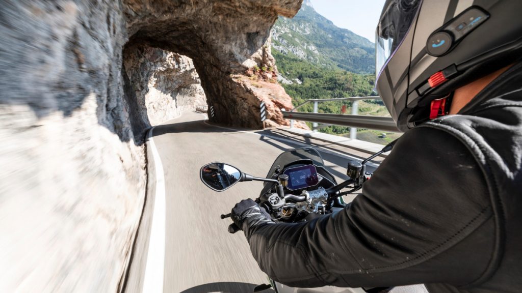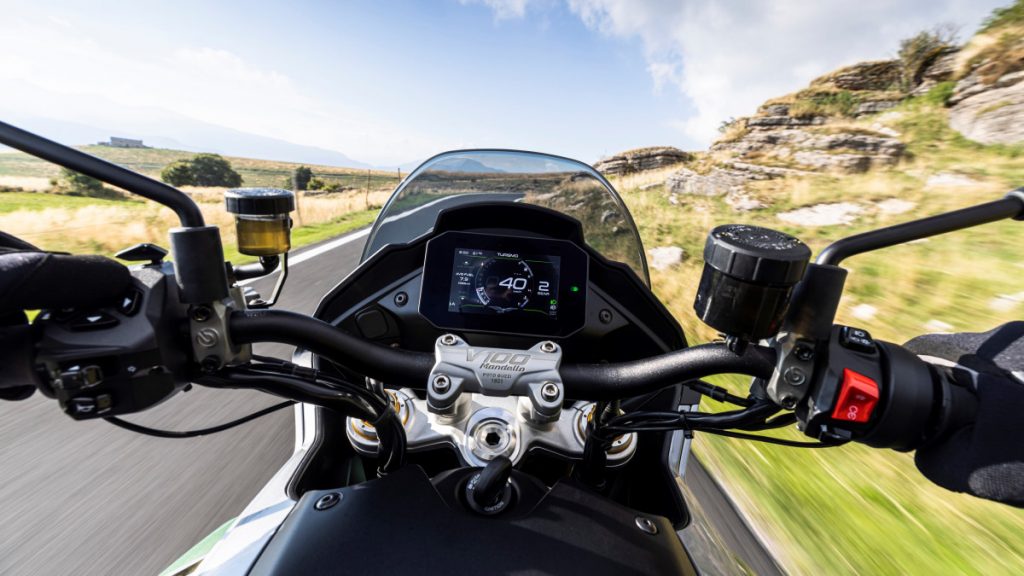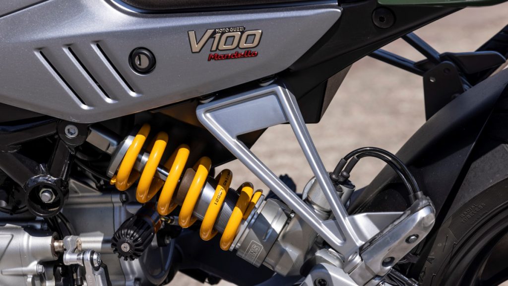 Les esthètes auront du mal à ne pas craquer pour la sonorité douce, profonde, entière et subtilement métallique que diffuse le nouveau bloc liquide Moto Guzzi. Avec cette nouvelle V100 Mandello, « tout a changé, mais rien n'a changé ». Il y a toujours ce rythme un peu syncopé, on sent qu'il reste un peu d'inertie, on arrive presque à imaginer le rythme des pistons, mais voilà, tout ceci se joue dans une partition, désormais plus moderne.
