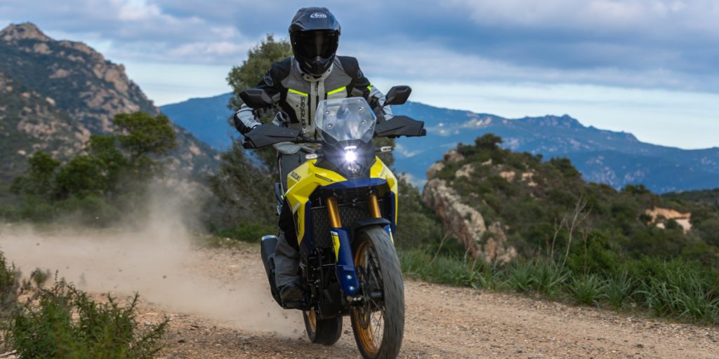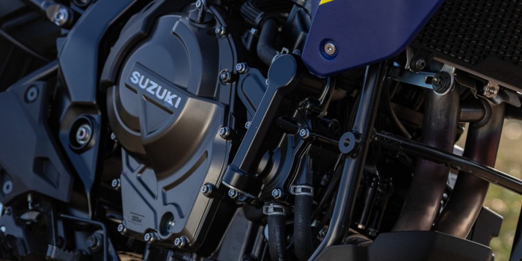 La V-Strom 800 DE sera notre première monture pour l'essai de ce nouveau moteur bicylindre parallèle de 776 cm3 à double arbre à cames en tête, avec 8 soupapes et refroidissement liquide. Ce twin développe 83 chevaux à 8 500 tr/min et 78 Nm à 6 800 tr/min. Il est équipé d'une boîte de vitesses à 6 rapports avec un embrayage à glissement limité (SCAS). Un Quickshifter up/down est fourni d'origine. Au niveau des aides à la conduite, le V-Strom bénéficie du SIRS (Suzuki Intelligent Ride System) qui comprend un ensemble de systèmes électroniques : la commande des gaz Ride-by-Wire, trois modes de conduite, le contrôle de traction réglable sur trois niveaux avec un mode Gravel, le Suzuki Easy Start System, le Low RPM Assist et le Quickshifter mentionné plus haut. À cela s'ajoute l'ABS qui est déconnectable sur la roue arrière. Pour cette nouvelle 800, Suzuki a opté pour un châssis tubulaire en acier. La V-Strom reçoit d'origine un porte-bagage et des valises rigides (avec top-case en option).
