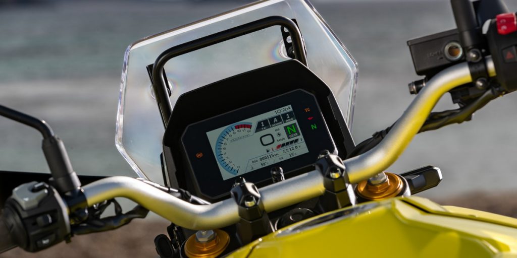 Comme mentionné plus haut, l'ABS est désactivable à l'arrière. Côté suspensions, Suzuki a fait appel à Showa avec une fourche inversée entièrement réglable à l'avant et un amortisseur arrière également réglable en précharge et en rebond. Les débattements sont respectivement de 130 mm et 220 mm. La V-Strom est équipée de jantes à rayons de 21 et 17 pouces avec des pneumatiques à chambre à air Dunlop Trailmax Mixtour (90/90 et 150/70). Provenant de la 1000 V-Strom, l'écran TFT est clair et indique la plupart des informations que l'on retrouve habituellement sur ce type de machine. Il passe automatiquement, après sélection dans le menu, de fond blanc pour le jour à fond noir pour la nuit. Notez que sur l'écran de cette V-Strom, une fenêtre supplémentaire illustre le réglage de l'ABS sélectionné. Sur le commodo gauche, on retrouve les commandes assez intuitives qui permettent de changer de réglage et de menu.
