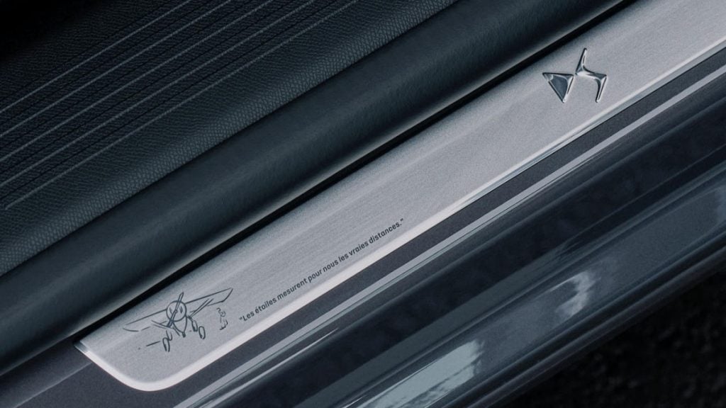 L'intérieur est un peu plus singulier. Et cela commence dès l'ouverture des portières où les seuils de portes chromés affichent une citation issue de l'œuvre à laquelle le modèle fait référence, "Pour les uns qui voyagent, les étoiles sont des guides" sur la DS3, : "Les étoiles mesurent pour nous les vraies distances" sur la DS4 et "Il est le chemin de l'échange entre les étoiles et nous" sur la DS7. La sellerie brun Criollo qui habille les sièges et le mobilier puise son inspiration dans les cuirs des pilotes de l'Aéropostale, la première compagnie pour laquelle l'auteur-aventurier a piloté. Et le tableau de bord est habillé d'un motif spécifique en surpiqûre point-perle propre à DS rappelant la traînée des avions.